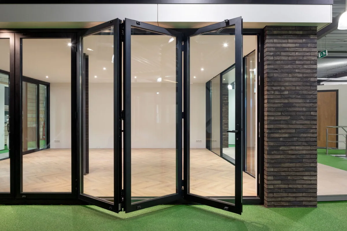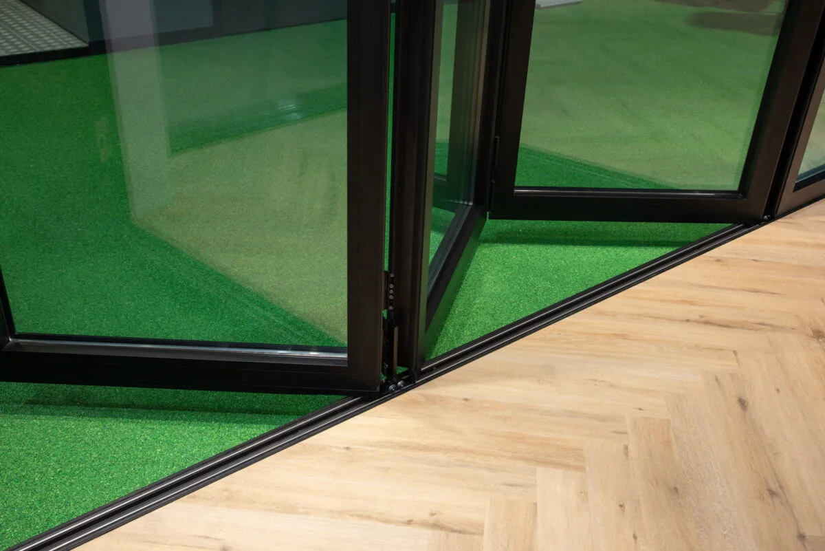 De aluminium harmonicadeur van Aluprof bestaat uit meerdere delen op een schuifrail. Door de delen een kant op de schuiven krijg je een mooie grote opening in de pui. Natuurlijk kan je ook maar een klein deel openen of alleen de loopdeur gebruiken.