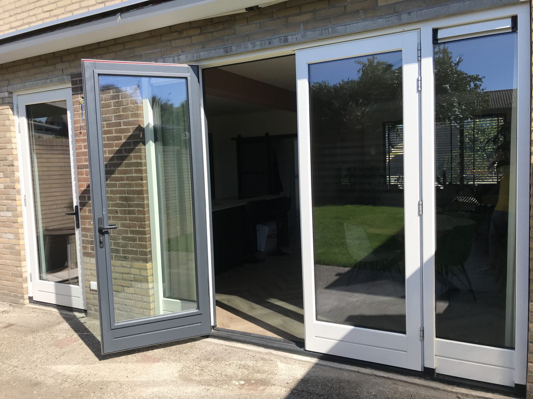 Dit zijn onze houten tuindeuren met twee zijlichten voorzien van een borstwering. Hiermee loopt de glaslijn van de tuindeuren door in de zijlichten. Bijkomend voordeel is dat de borstwering opspattend vuil bij regenval tegenhoud en de ruiten niet zo snel smerig worden.